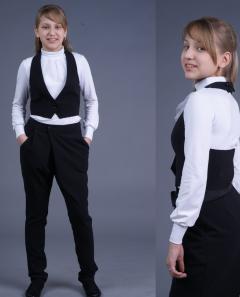 Темный жилет с открытой спиной и на подкладе. Логическое продолжение классического стиля костюма молодой девушки.
