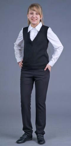 На снимке показан жилет в костюме с блузкой и зауженными брюками.